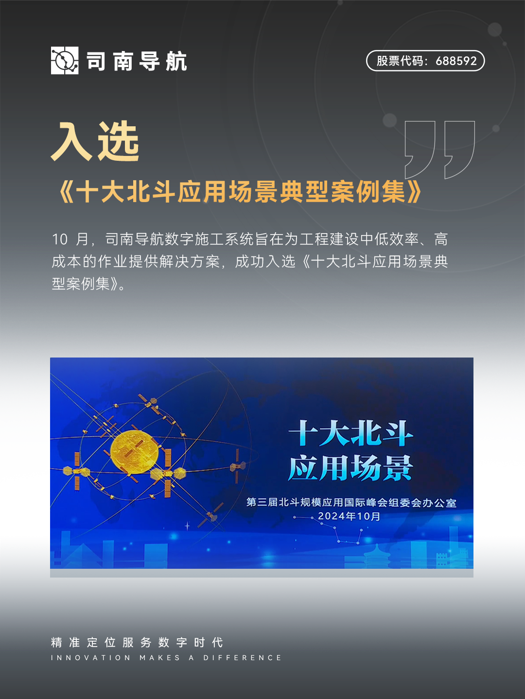 —— 司南导航数字施工系统采用北斗高精定位技术、组合导航和倾角传感器等技术,确保精准高效,完成数字化引导,真正为智慧工地降本增效,成功入选《十大北斗应用场景典型案例集》。