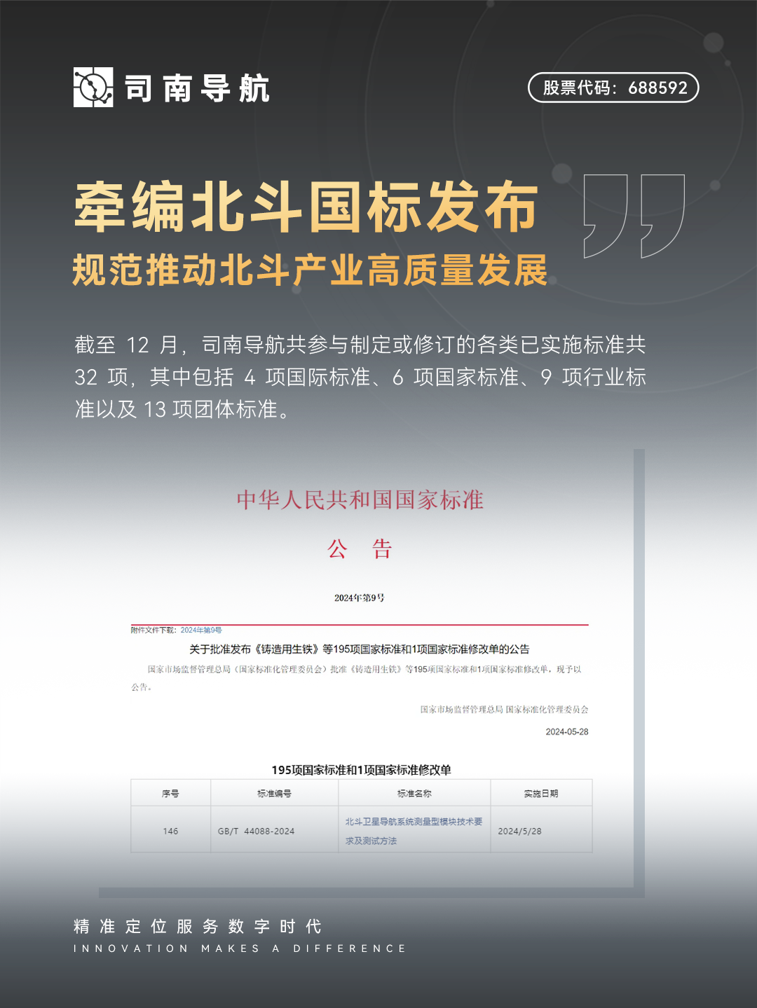 —— 由司南导航主要起草的《北斗卫星导航系统测量型模块技术要求及测试方法》国家标准正式实施,主要参与编制的《陆上风电场设施变形测量技术规程》《高精度智能全站仪技术要求》《电力北斗地基增强系统基准站运行维护技术规范》团体标准正式获批发布。