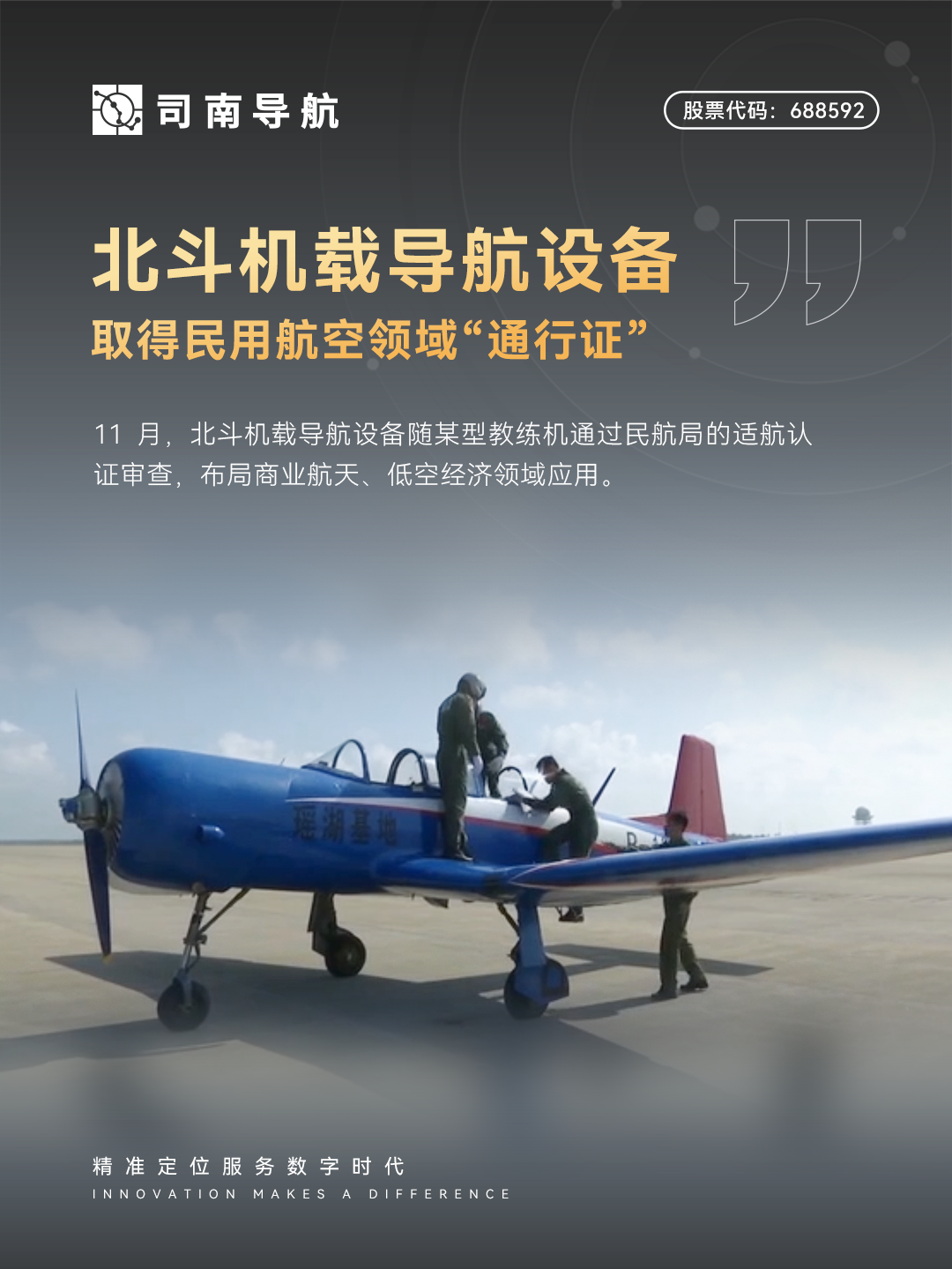 —— 积极布局北斗在商业航天、低空经济等领域的应用技术研发,推动北斗导航系统与国家重点工程的深度融合,取得民用航空领域“通行证”。