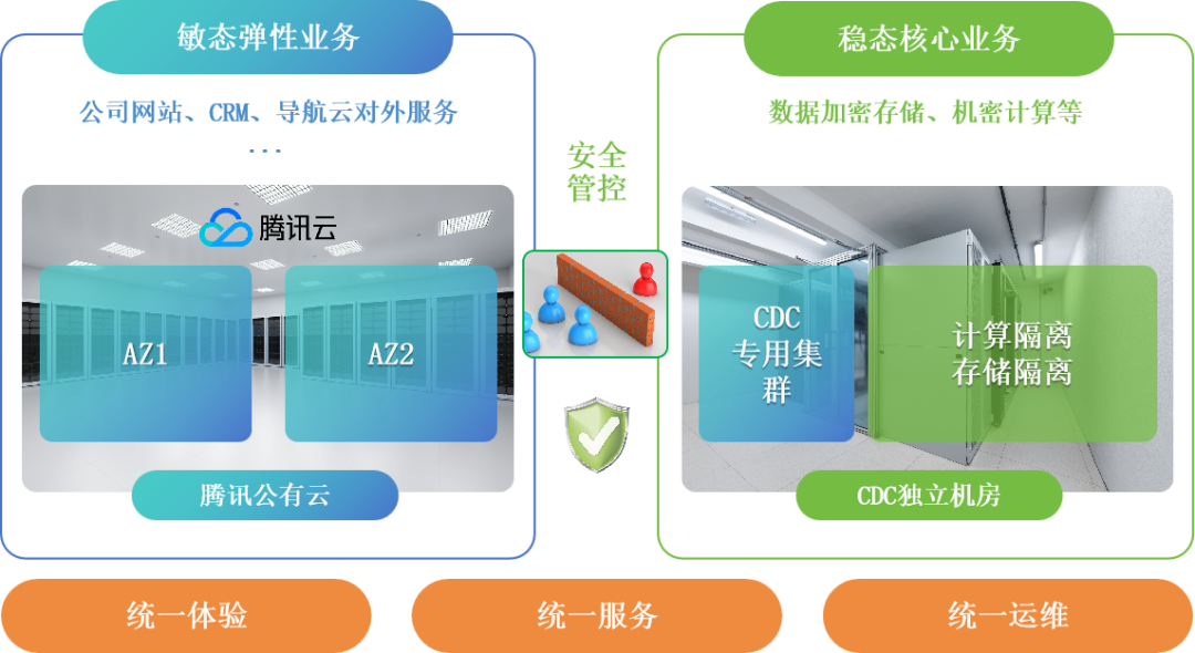 双方将基于腾讯云的私有化数据中心方案,打造司南导航专用数据中心,并与其他业务形成混合云架构。该架构将同时满足国家政策要求,并显著提升业务的稳定性和可靠性。本次建设的私有数据中心具备以下几个特点: