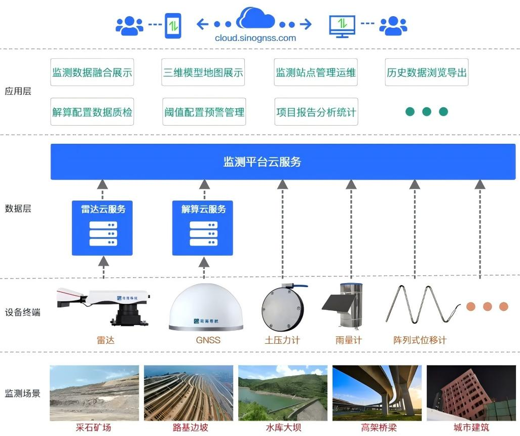 本系统由监测点传感器系统、控制中心和自动化监测预警平台三大核心组成部分组成。三者形成 “数据采集 - 处理 - 预警” 的完整闭环,实现滑坡风险的实时、全天候监测。系统采用 “GNSS 接收机 + 边坡雷达 + 多类环境传感器” 的多传感器融合监测方案,可实现高精度、连续性的数据采集。