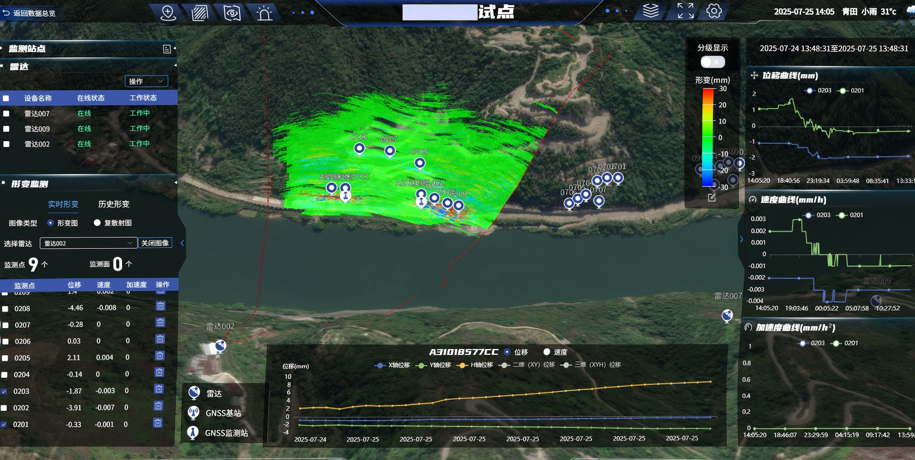 结合优势:雷达提供 “全局变形图景”,解决 GNSS “点监测覆盖范围有限” 的问题;GNSS 在雷达识别的异常区域进行 “单点高精度追踪”,弥补雷达在局部点位(如复杂地形区)精度可能不足的缺陷,实现 “宏观趋势把控 + 微观细节捕捉” 的协同。