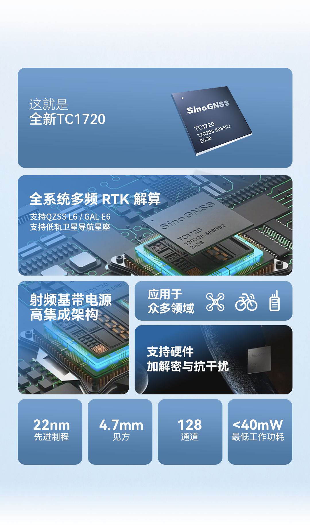 支持片上全系统多频RTK解算,支持QZSS L6 / GAL E6,支持低轨卫星导航星座