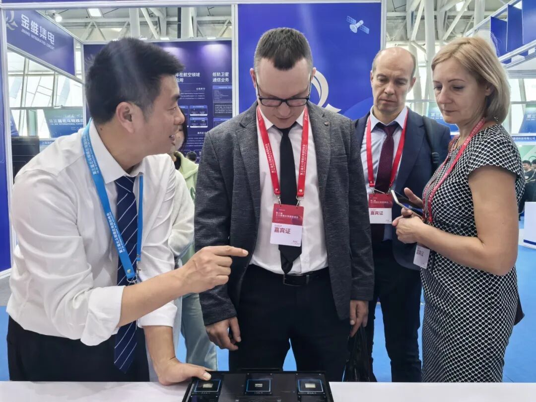 司南导航海外业务部总监彭海明为外宾代表介绍司南导航自研芯片及模块产品