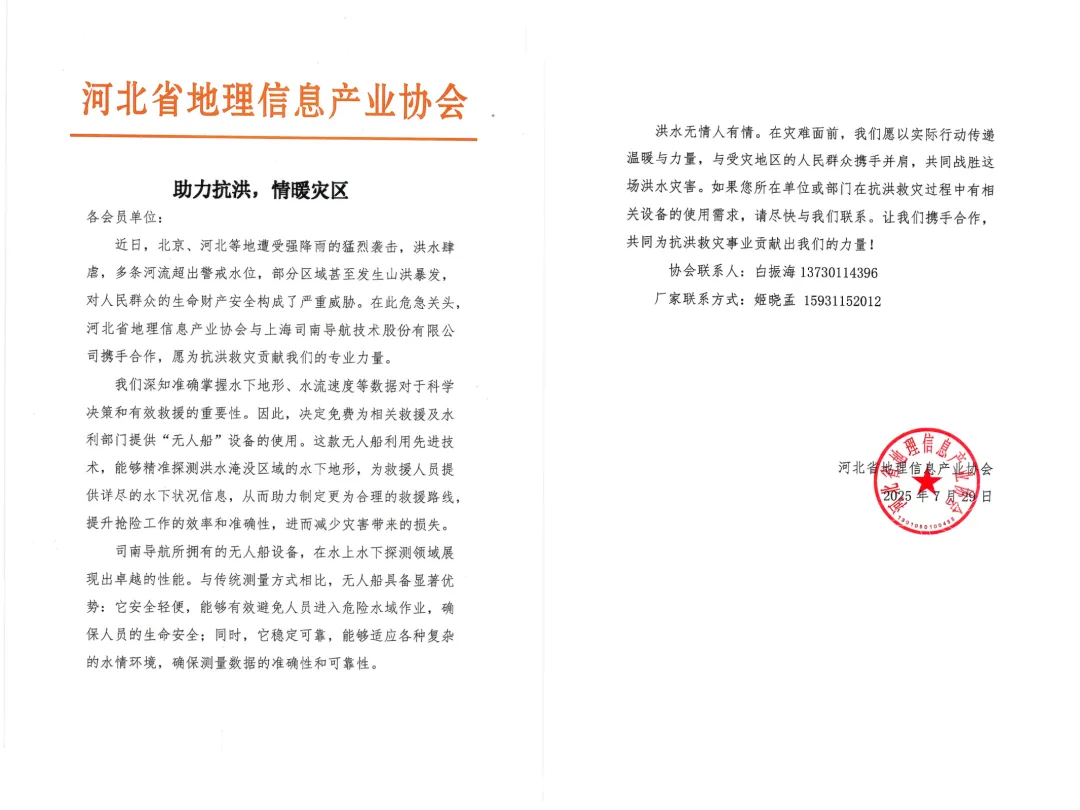灾情发生后,上海司南导航技术股份有限公司(下称“司南导航”)联合承德今图地理信息有限公司,携司南导航Lu8激光双摄RTK超站仪、Lu3北斗版RTK等多款高精度定位设备,紧急驰援灾区,第一时间投入抢险,为防汛一线提供关键定位保障。
