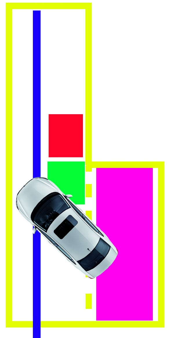 右前轮外侧点监测距离路边缘线30CM,上坡过程中根据右前轮外侧点所在的区域,右前轮外侧点在粉色区域提示“向左”、右前轮外侧点在蓝色区域提示“向右”打方向,右前轮外侧点在黑色区域提示“回正”打方向,车头点应该在绿色区域上方,当车头点到红色区域时,提示控制车速,车速控制在0.4—0.6KM/H,小于0.4km/h提示“加速”,大于0.6km/h提示“减速”当车头点到绿色区域,提示停车。30秒内起步,提示起步倒计时,如有溜车,提示“溜车、踩紧刹车、重新起步”。