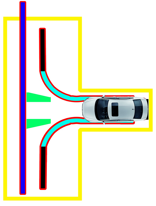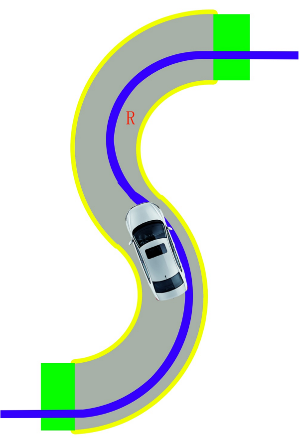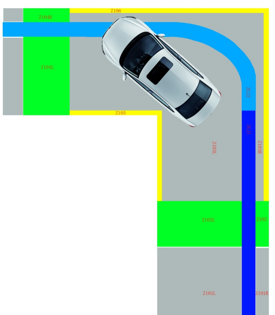图中蓝色带为测量右前轮最合理行驶轨迹,右前轮按照最合理轨迹行驶,车辆必然合格。行进中偏左提示“向右”打方向,偏右提示“向左”打方向,采用分及提示音,缓慢提示音为慢打方向,急促提示音为快打方向,车速度接近零时(<0.4KM/H)提示“不可中途停车,请前进”,还需把操作技巧融入操作提示中(车轮进入浅蓝色区域提示“向左打死”)。