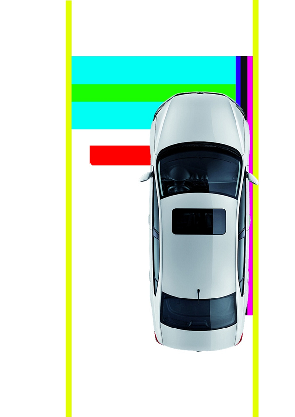 首先区分前进状态和后退状态,车辆前进状态,进入侧方区域,蓝色轨迹引导车辆开到合理位置,车辆左前轮应落在蓝色区域,进入侧方区域,如果左前轮在蓝色轨迹左侧提示“向右”,如果左前轮在蓝色轨迹右侧提示“向左”,开始倒车,首先保持方向回正倒退,车辆右后轮进入绿色区域,提示“向右打死”,车辆左后轮进入粉色区域提示“向左打死”,车辆左前轮进入粉色区域提示“停车”,整个倒车过程车速控制在0.6—1KM/H,小于0.6km/h提示“加速”,大于1m/h提示“减速”出库,向左打死向外开车,当左前轮到蓝色区域,提示方向操作同进入侧方,不停车直接通过侧方结束区域。